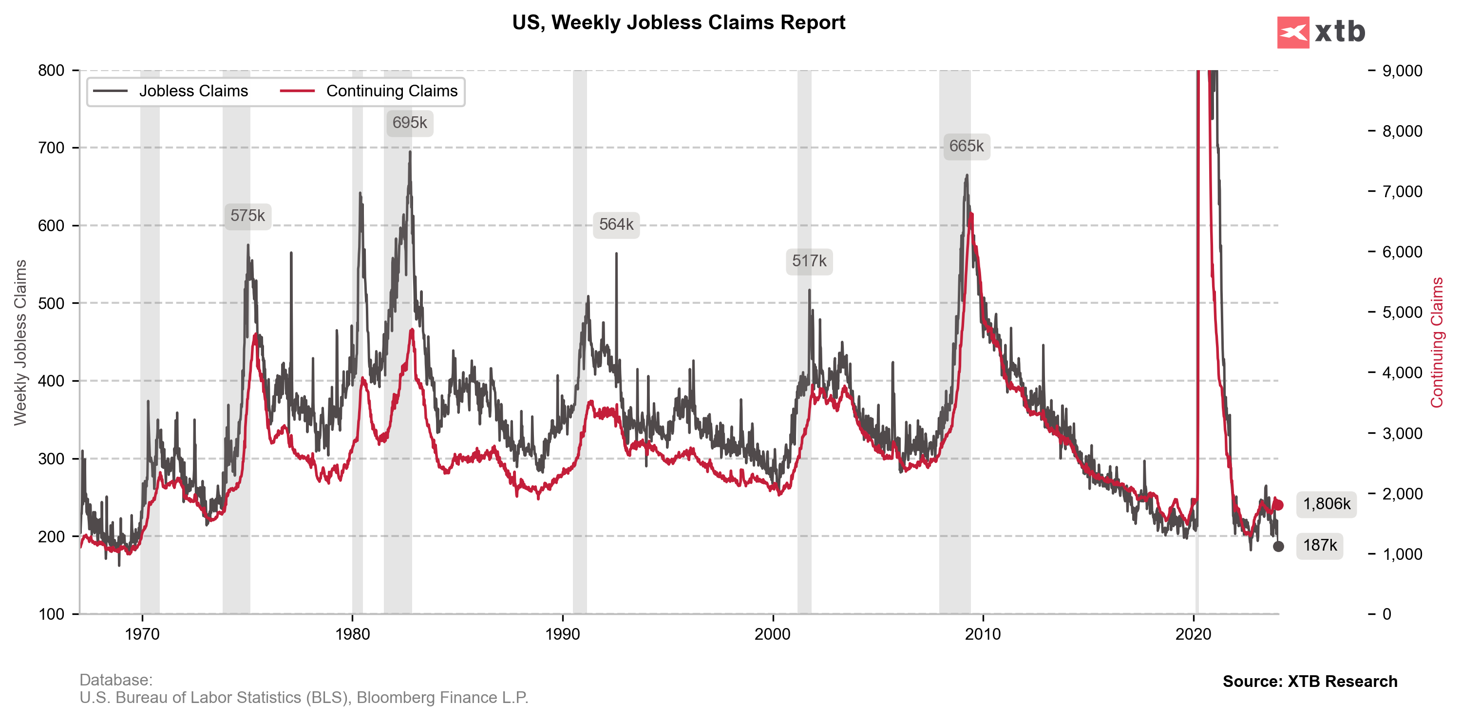 Údaje ukázali oveľa nižší počet žiadostí o podporu v nezamestnanosti, zatiaľ čo Wall Street očakávala o niečo vyššie číslo ako predtým. Navyše, údaje o pokračujúcich žiadostiach sú tiež oveľa nižšie, než sa očakávalo. Dnešné údaje signalizujú, že americký trh práce je vo veľmi dobrej kondícii, čo môže signalizovať vyššie riziko ďalšej vlny inflácie, ak dôjde k nejakým ponukovým šokom. V dôsledku toho Fed možno bude chcieť držať úrokové sadzby vyššie a v januári, ani v marci ich nezníži. Aj údaje o začatých stavbách na bývanie a stavebných povoleniach boli silnejšie, ako sa očakávalo, a to napriek veľmi vysokým reálnym sadzbám v americkej ekonomike.