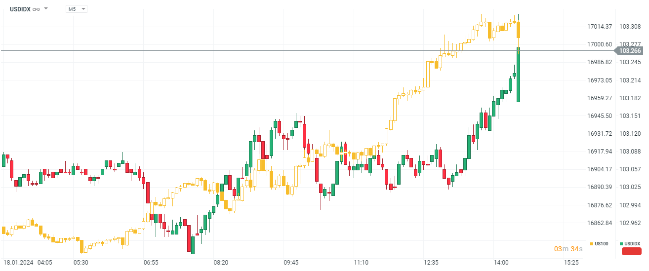 Vidíme, že US100 stráca po údajoch z amerického trhu práce a americký dolár (USDIDX) posilnil po obrovskej rally na 10-ročných štátnych dlhopisoch, ktoré po dnešných silných makroúdajoch vzrástli zo 4,09 na 4,12 %. Aj Fed Bostic sa vyjadril, že ak sa pokrok v inflácii spomalí, jastrabia politika vyšších sadzieb na dlhšie obdobie bude opodstatnená.