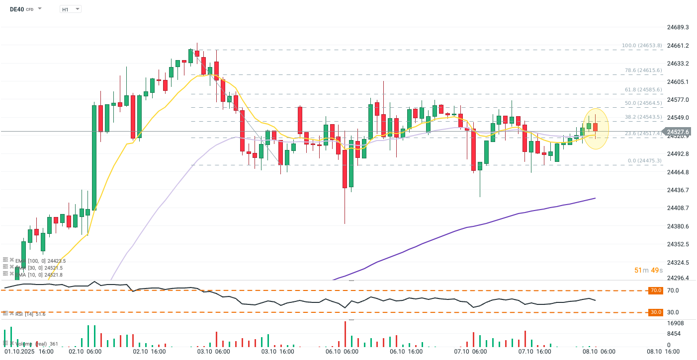 - DE40 klesol a odrazil sa od EMA30 v intervale H1.
