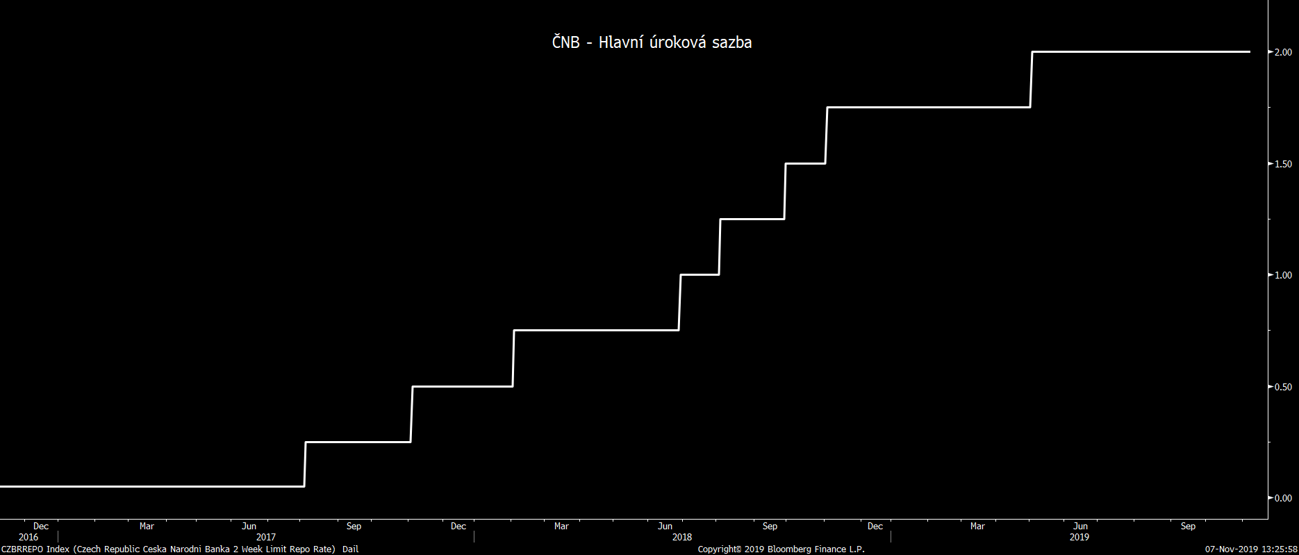 Vývoj hlavní úrokové sazby ČNB (v %). Zdroj: Bloomberg