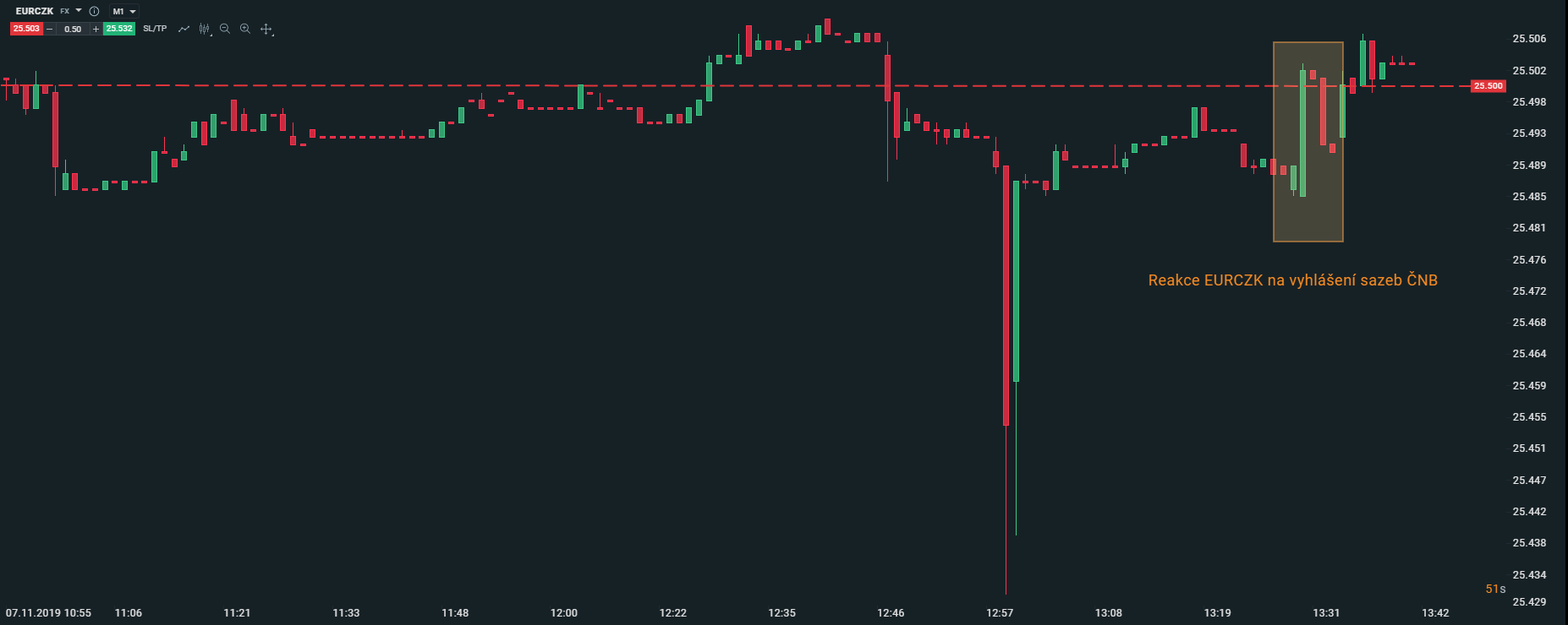 EURCZK, Interval M1. Zdroj: xStation5