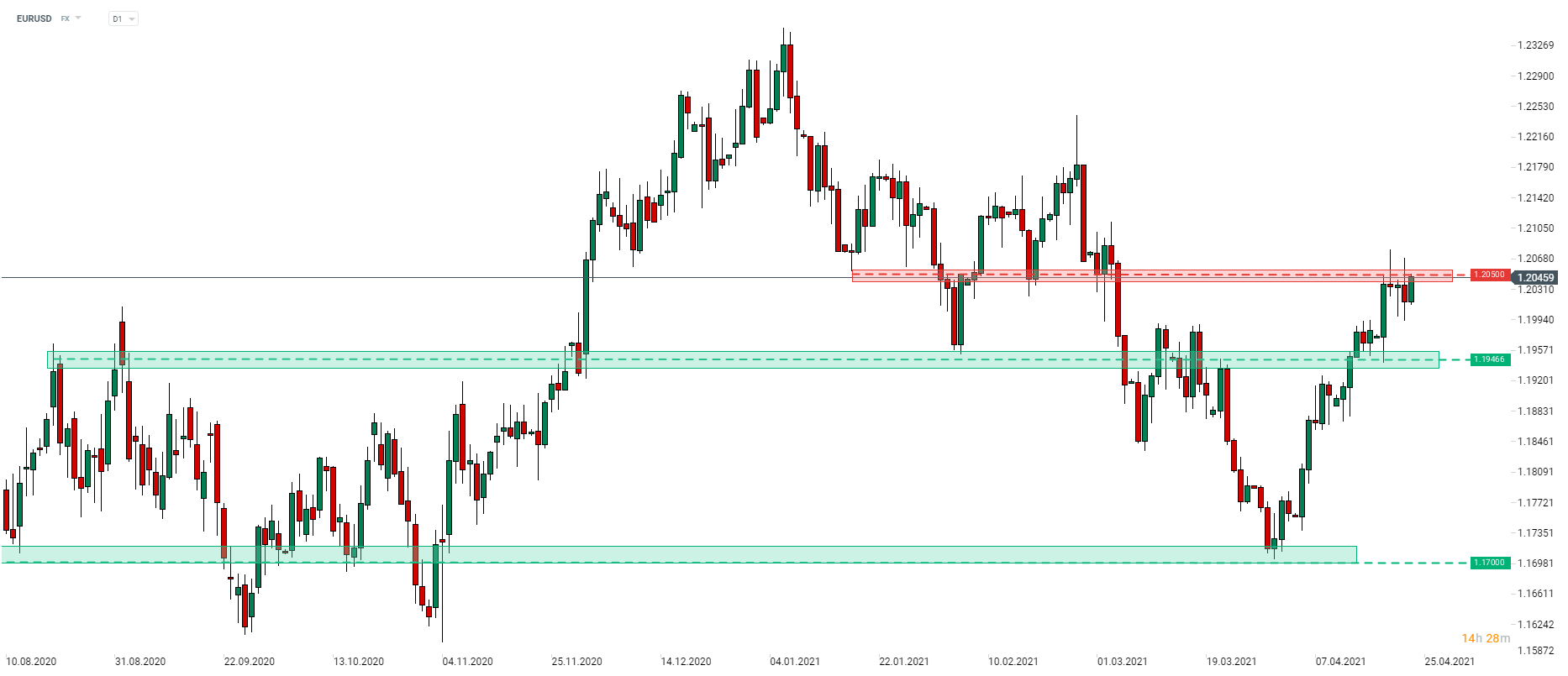 EURUSD rozšíril zisky po vydaní solídnych flash PMI dát z Európy. Pár navyše podporuje slabý americký dolár. EURUSD dnes podniká ďalší pokus o prelomenie sa nad zónou odporu 1.2050. Zdroj: xStation5