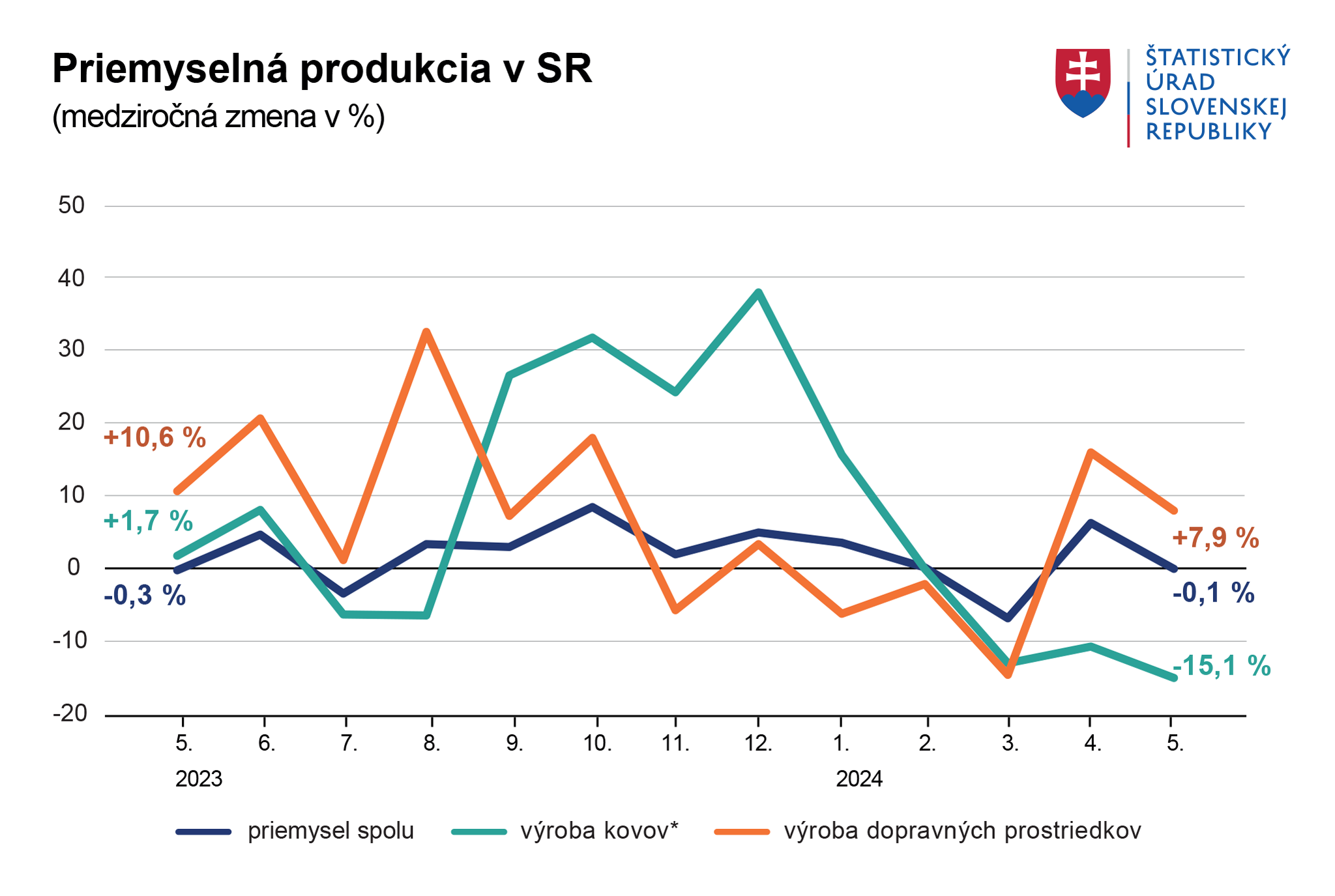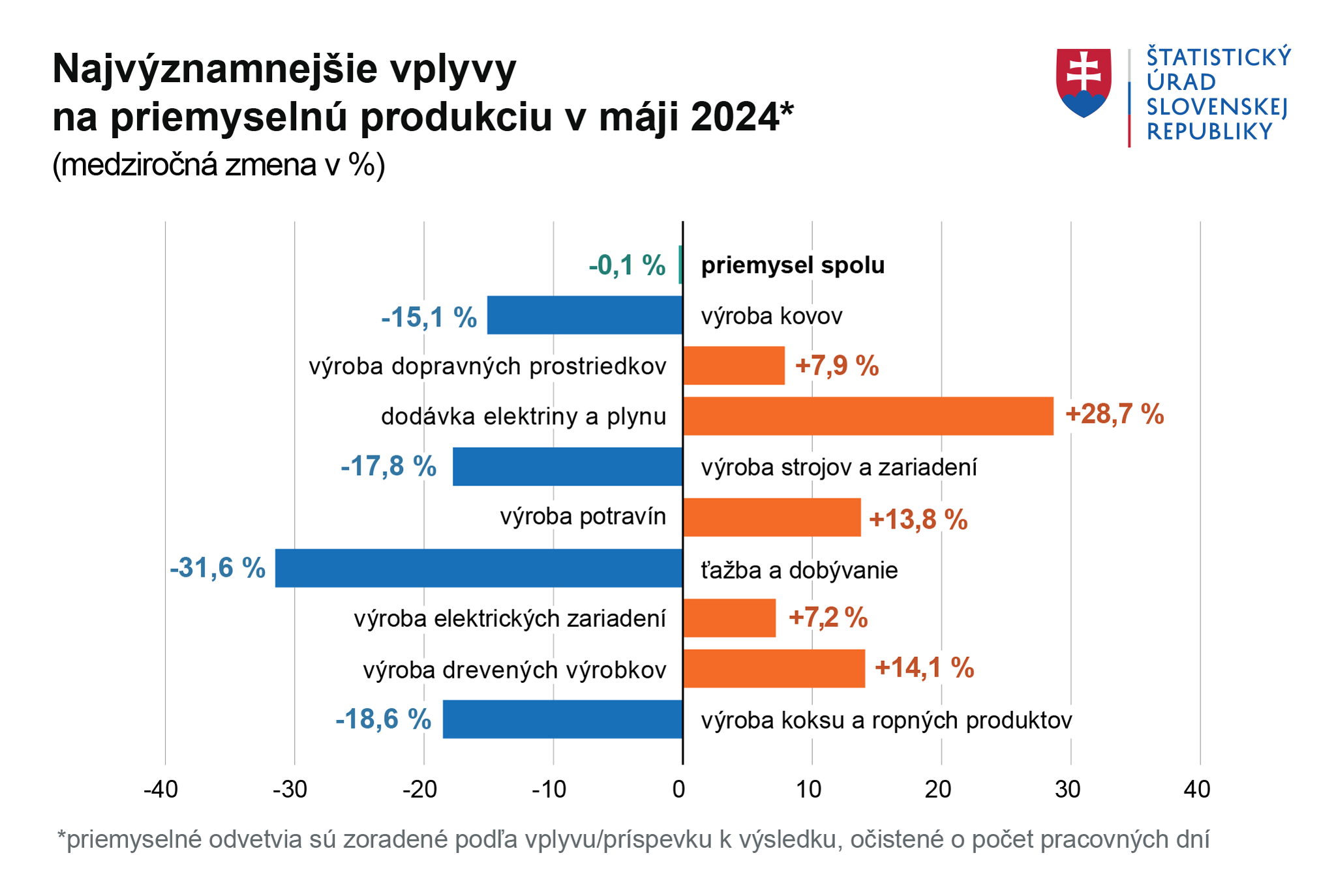 Najvýznamnejší vplyv na medziročné hodnoty priemyselnej produkcie mali kľúčové odvetvia ako napríklad výroba dopravných prostriedkov, ktorá pokračovala v raste a zaznamenala medziročný rast na úrovni 7,9 %. Pozitívne taktiež prispievala dodávka elektriny a plynu alebo výroba potravín, elektrických zatia´dení alebo drevených výrobkov. Na druhej strane najvýraznejšie prepady sme zaznamenali pri výrobe kovov, ktorá sa medziročne prepadla o viac ako 15 %.