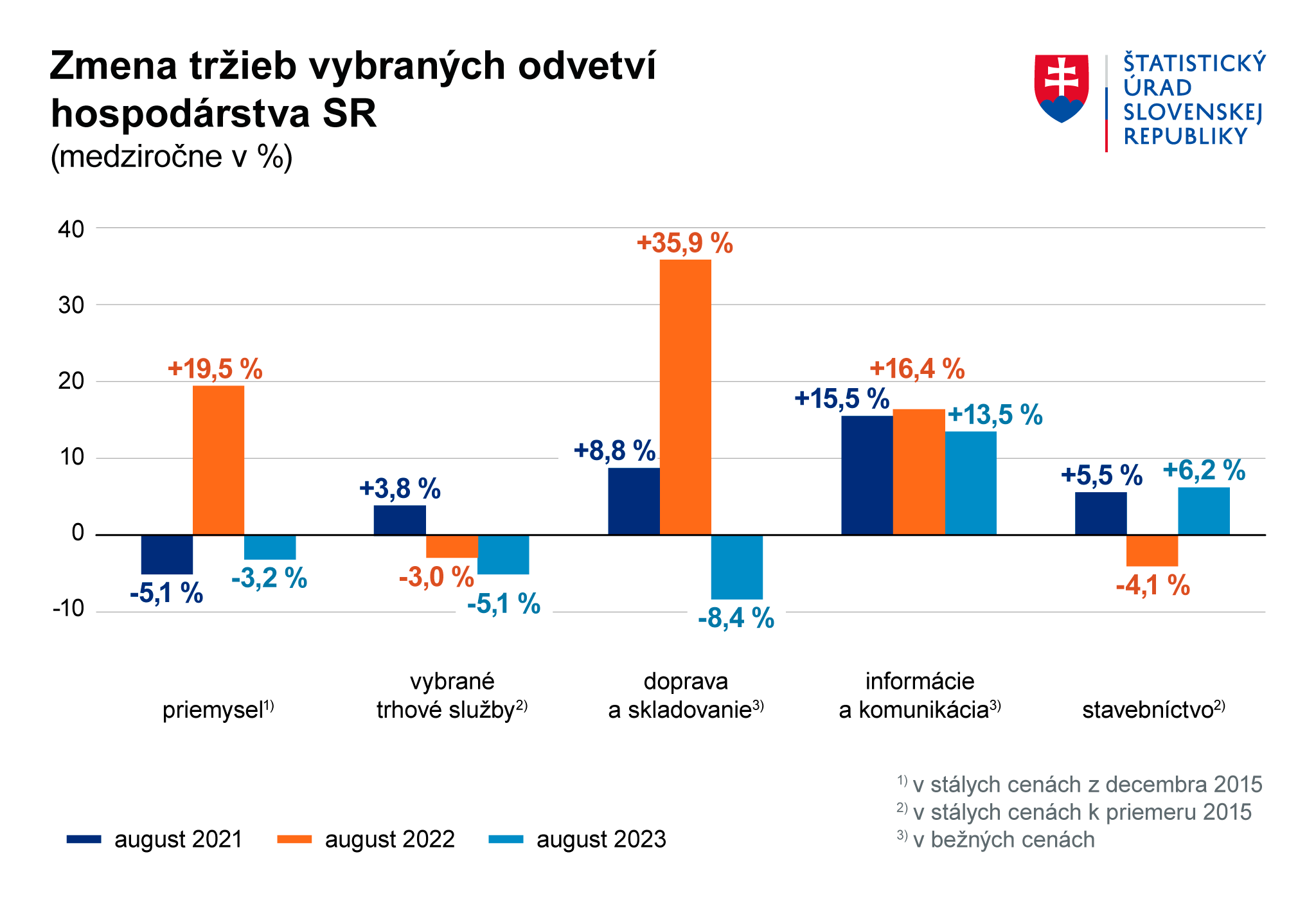 Medziročne však tržby vzrástli iba v 2 sektoroch, ktorými sú informačné a komunikačné činnosti a stavebníctvo. V prípade informačného sektoru bol medziročný nárast o 13,5 % a stavebné firmy sa mohli tešiť 6,2 % nárastu. Priemysel, navýraznejšia zložka, zaznamenala medziročný pokles tržieb o 3,2 %. Ku tomuto poklesu hlavne prispel medziročný pokles tržieb v oblasti dodávky elektriny a plynu a tržieb vo výrobe kovov. Vo vybraných trhových službách poklesli tržby o 5,1 %. Sektoru dopravy a skladovania tržby poklesli o 8,4 %.