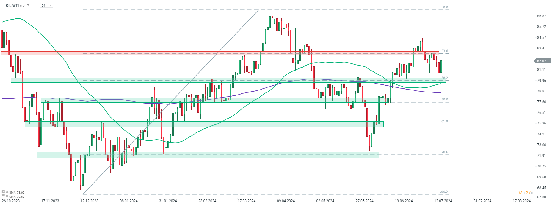 WTI (OIL.WTI) sa po údajoch o zásobách v USA stiahla z denných maxím. Komodita sa však naďalej obchoduje o viac ako 1 % vyššie v priebehu dňa. Zdroj: xStation5
