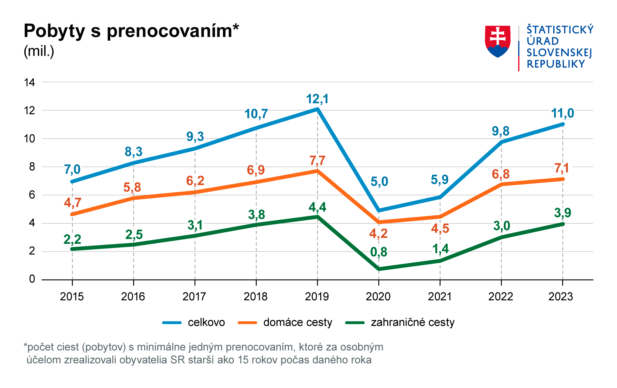 Za tok 2023 slováci absolvovali až 11 tis. pobytov s prenocovaním. Oproti roku 2022 tak počet ciest vzrástol až o 13 %, avšak stále nedosiahli predkovidových úrovní v roku 2019 avšak dosiahli sme hodnôt z roku 2018. Výrazné oživenie sme pozorovali hlavne v zahraničných cestách, ktoré sa na celkovom počte podieľali až z 36 %, čo sú približne hodnoty spred pandémie. Najčastejšie slováci cestovali už ako tradične, do Česka, kde sa uskutočnillo až 880 tis. pobytov. Druhou najobľúbenejšou destináciou slovákov bolo Chorvátsko s 424 tis. pobytov. Nasledovalo Maďarsko, Taliansko, Poľsko a Rakúsko, ale aj Turecko a Grécko. Dlhodobé pobyty pritom tvorili až 2-3 z celkových zahraničných ciest.