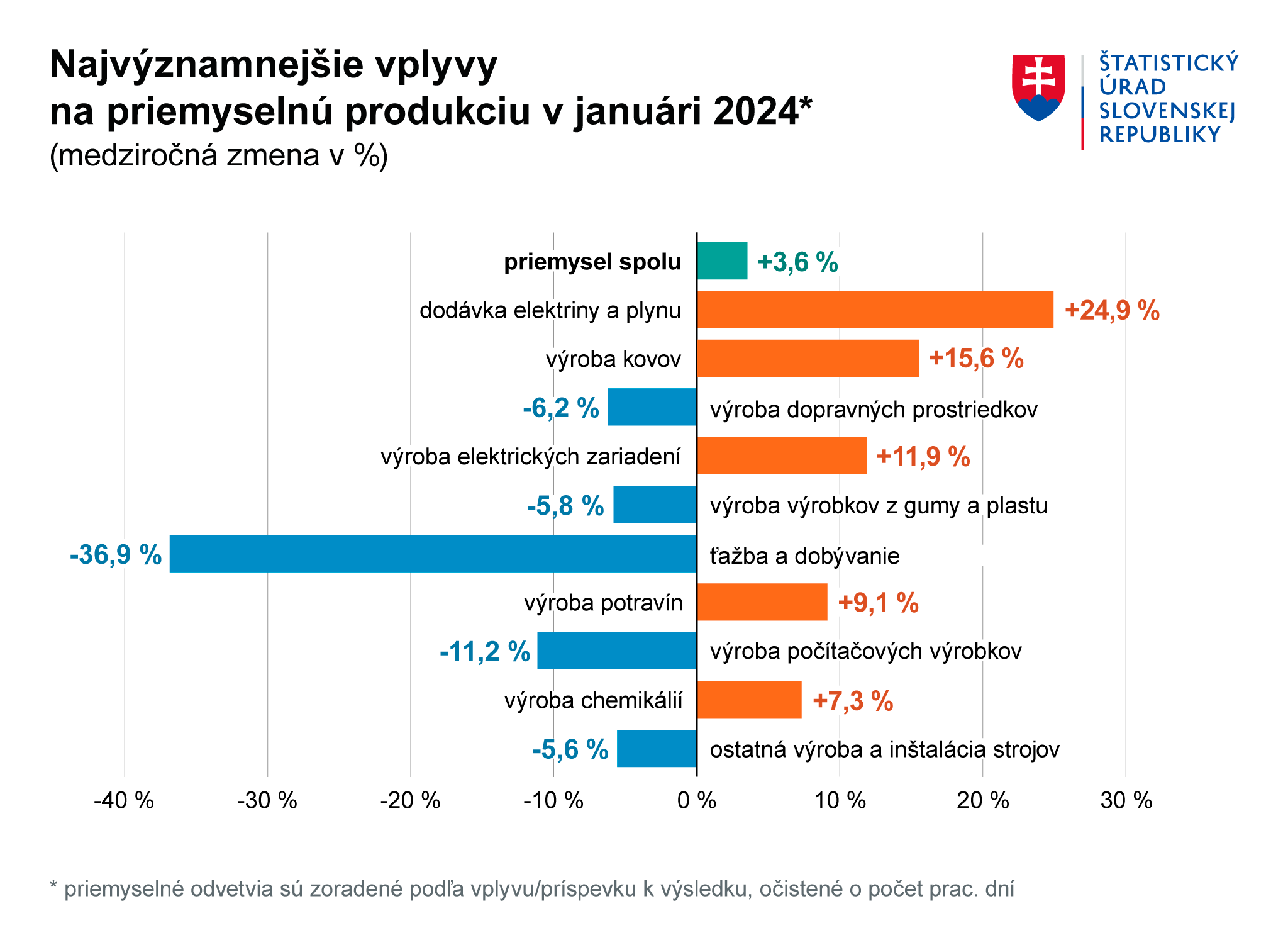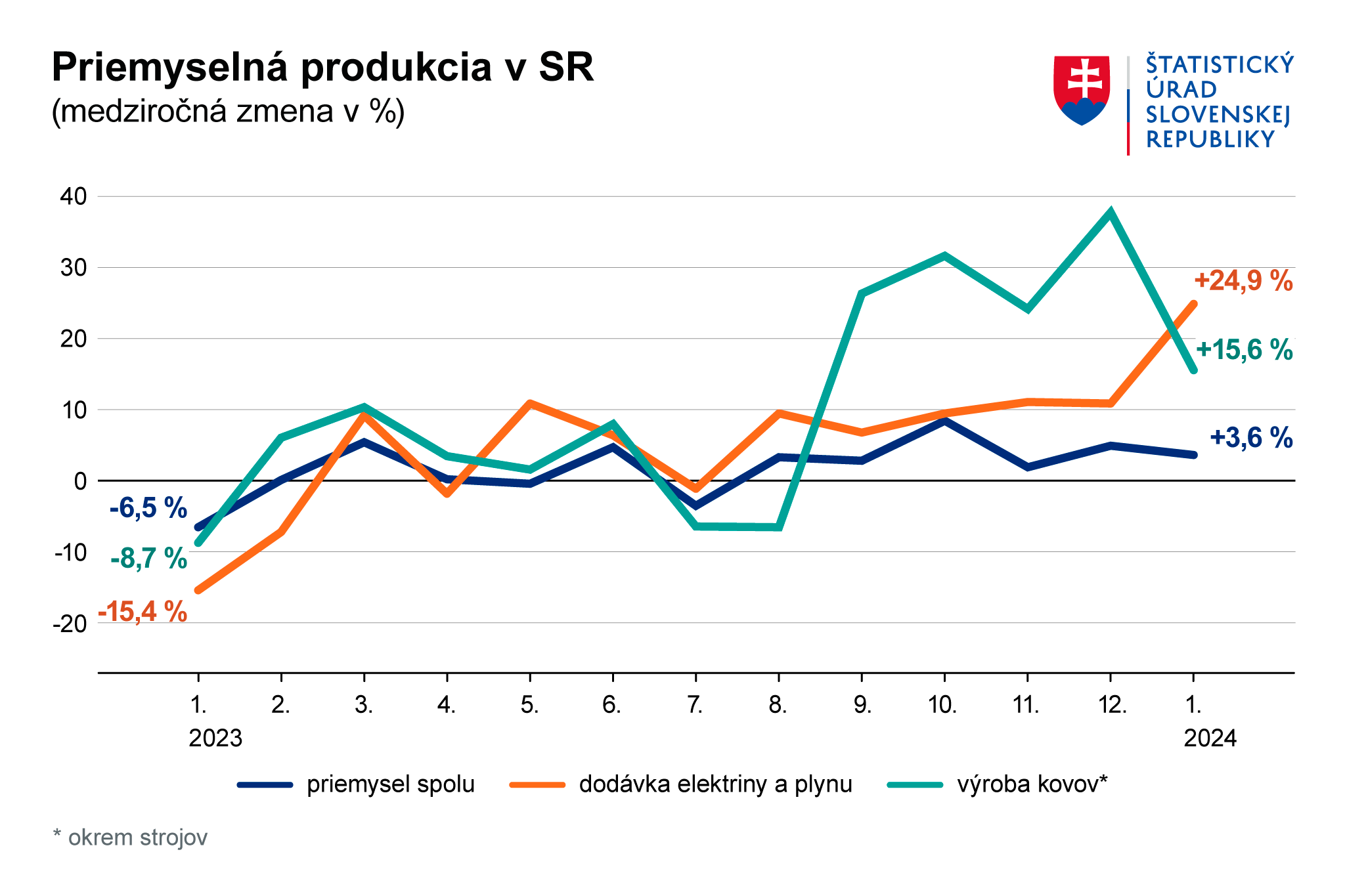 Slovenský priemysel v mesiaci január vzrástol o 3,6 % medziročne. Začiatok roka je tak pre Slovenskú ekonomiku poztívnym napriek tomu, že najvýznamnejší segment priemyslu - výroba dopravných prostriedkov, zaznamenal medziročný pokles produkcie až o 6,2 %. Priemyselná produkcia tak už rastie šiestym mesiacom v rade.