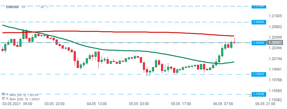 EURUSD se obchoduje v blízkosti úrovně 1,2050. Zdroj: xStation5