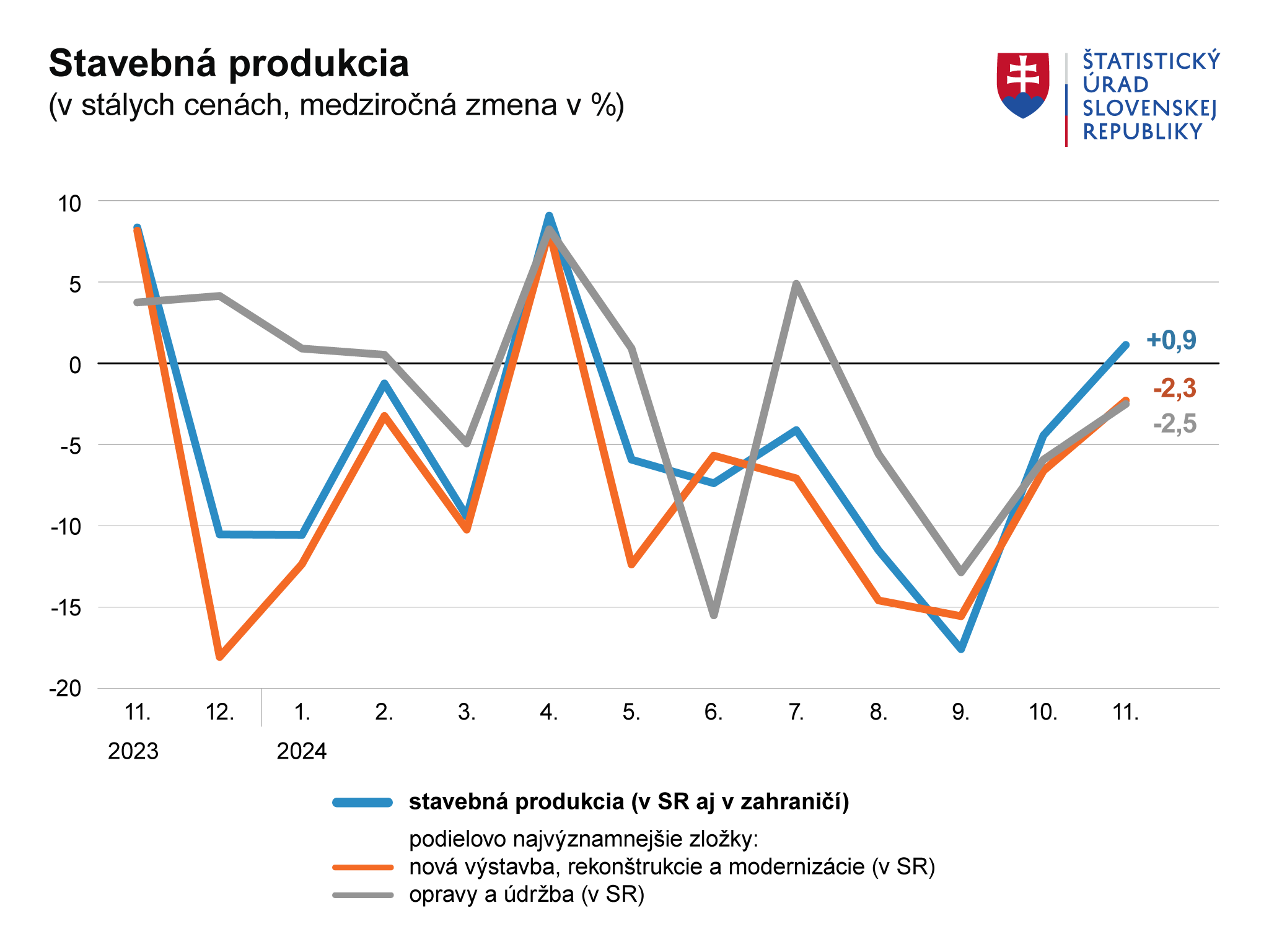 Produkcia v stavebníctve dosiahla v novembri 2024 hodnotu 827,5 mil. eur, čo znamená medziročný nárast o 0,9 % a ukončenie šesťmesačného obdobia poklesov. Medzimesačne produkcia vzrástla o 5,4 %. Pozitívny vplyv mal najmä rast zahraničnej produkcie (+18,7 %), ktorá prekročila 10 % celkového podielu odvetvia