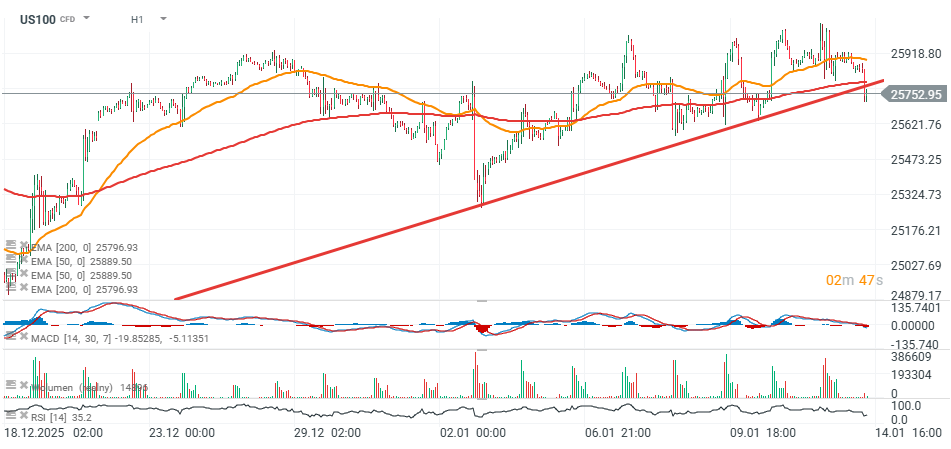 Pred kľúčovými americkými makroúdajmi a rozhodnutím Najvyššieho súdu USA o clách zostáva sentiment okolo amerických akciových indexov výrazne negatívny. Napriek včerajším povzbudivým údajom o CPI trhy túto správu z väčšej časti ignorovali a akcie uzavreli nižšie. Futures na Nasdaq 100 (US100) klesajú o viac než 0,5 %, zatiaľ čo VIX rastie približne o 3 %. Ak sa US100 rýchlo nevráti nad 25 800, býci môžu mať problém udržať rastové momentum v krátkodobom horizonte. Index bol v poslednom období štyrikrát odmietnutý v oblasti 26 000 bodov a aktuálne klesol pod dva kľúčové kĺzavé priemery – 50- a 200-obdobový EMA. RSI smeruje k 35, ale zatiaľ nevstúpil do prepredanej zóny.