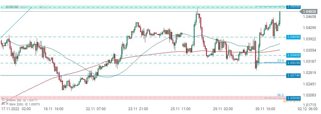 EURUSD se dnes obchoduje výše a dnešní data poskytla více paliva pro býky. Hlavní měnový pár se aktuálně blíží k zóně odporu v oblasti 1,0500. Zdroj: xStation5