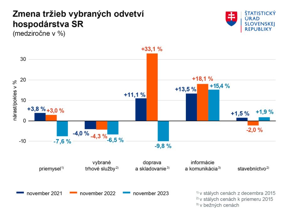Podobne na tom boli aj tržby vo vybraných trhových službách, ktoré poklesli o 6,5 % a tržby podnikov dopravy a skladovania, ktorým tržby v novembri poklesli o 6,5 % medziročne.
