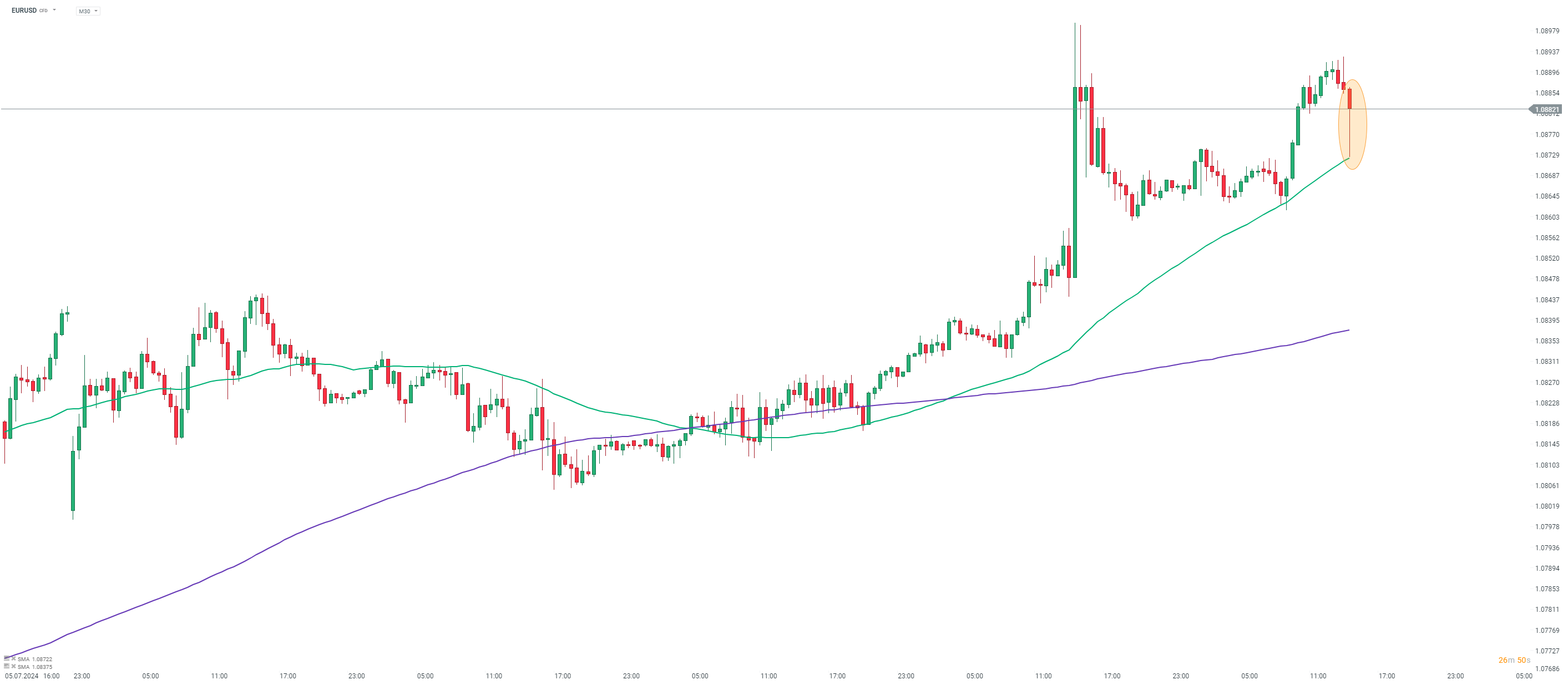 EURUSD po zverejnení údajov o americkom PPI klesol a testoval 50-periodický kĺzavý priemer na 30-minútovom intervale. Zdroj: xStation5