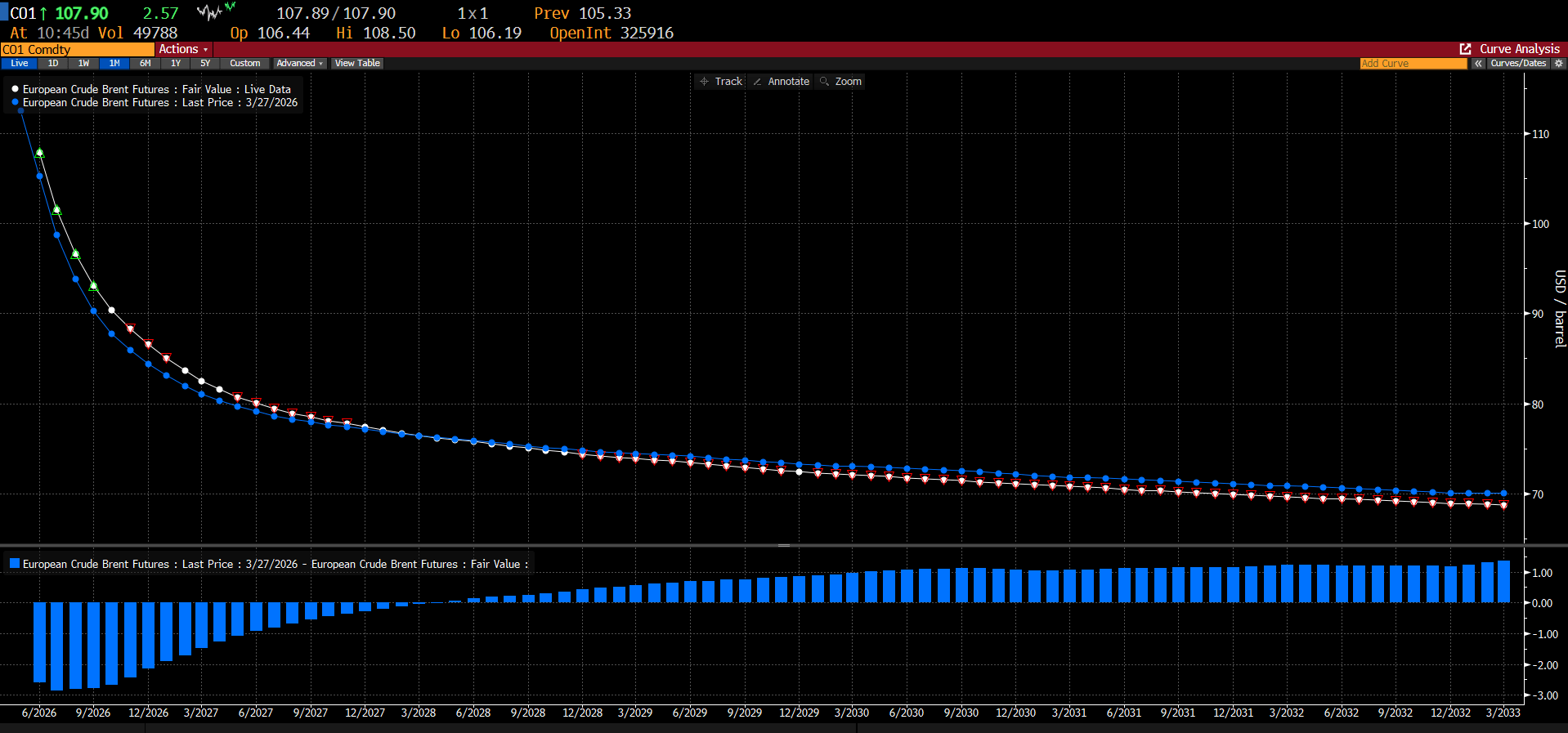Trh zostáva vo výraznej backwardation, keď sa spotové ceny a kontrakty na prednom konci krivky obchodujú výrazne vyššie. Nedávno bol spread medzi fyzickou ropou, teda Dated Brent, a najbližším mesačným kontraktom až 15 USD. Odvtedy sa zúžil pod 10 USD a dostal sa na úrovne 6–7 USD. To neznamená, že trh už nie je napätý. Skôr to odráža rast dlhého konca krivky a určité ničenie dopytu.