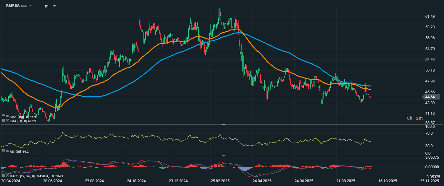 Akcie spoločnosti Bristol Myers Squibb sa aktuálne obchodujú okolo úrovne 44,64 USD a naďalej sa pohybujú v klesajúcom trende. Cena sa v súčasnosti nachádza pod oboma kĺzavými priemermi – EMA 50 (46,13 USD) aj SMA 100 (46,91 USD) – čo z technického pohľadu naznačuje, že medvedí trend zatiaľ nebol prelomený. Predchádzajúci rastový pokus bol rýchlo odmietnutý a cena sa opäť stiahla pod tieto dôležité rezistencie. RSI sa nachádza na hodnote 44,2, teda v neutrálnom pásme, no pod 50bodovou hranicou, čo svedčí o mierne prevažujúcom predajnom tlaku.