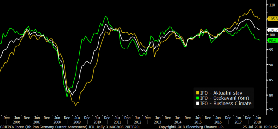 Z makrokalendáře dnes zaujaly hlavně výsledky německého indexu IFO. Ten dnes ale pouze naplnil očekávání, když v minulém měsíci klesl na 101,7b. Co se samotné struktury indexu týká, tak zatímco index očekávání dál klesá (98,2b.), index aktuální situace v minulém měsíci dokázal mírně růst (105,3b.).