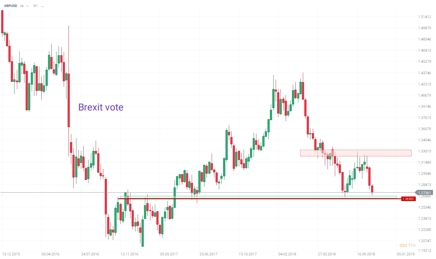 Z technického pohledu můžeme vidět výrazný support páru GBPUSD na úrovni 1,2650. V její blízkosti existuje více lokálních lows i highs a býci by ji mohli využít jako odrazový můstek po posledním strmém výprodeji. Alespoň do doby, než by přišly další informace okolo vyjednávání o podobě Brexitu.