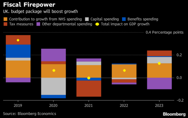 Vláda premiérky Mayové oznámila mírnou fiskální expanzi - pokud by nebylo Brexitu, libra by z posledních kroků vlády těžila. Zdroj: Bloomberg