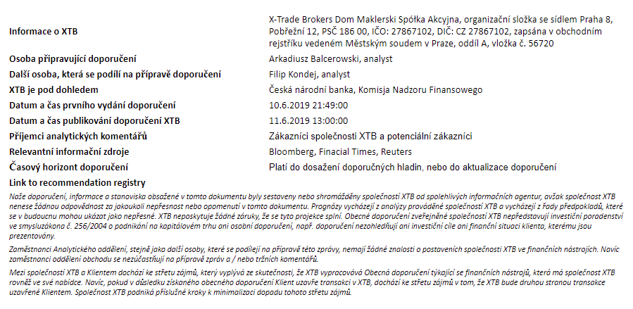 Tento materiál je marketingovou komunikáciou v zmysle čl. 24 ods. 3 smernice Európskeho parlamentu a Rady 2014/65/EÚ z 15. mája 2014 o trhoch s finančnými nástrojmi, ktorou sa mení smernica 2002/92/ES a smernica 2011/61/EÚ (MiFID II). Marketingová komunikácia nie je investičným odporúčaním ani informáciou odporúčajúcou alebo navrhujúcou investičnú stratégiu v zmysle nariadenia Európskeho parlamentu a Rady (EÚ) č. 596/2014 zo 16. apríla 2014 o zneužívaní trhu (nariadenie o zneužívaní trhu) a o zrušení smernice Európskeho parlamentu a Rady 2003/6/ES a smerníc Komisie 2003/124/ES, 2003/125/ES a 2004/72/ES a delegovaného nariadenia Komisie (EÚ) 2016/958 z 9. marca 2016, ktorým sa dopĺňa nariadenie Európskeho parlamentu a Rady (EÚ) č. 596/2014, pokiaľ ide o regulačné technické predpisy upravujúce technické opatrenia na objektívnu prezentáciu investičných odporúčaní alebo iných informácií, ktorými sa odporúča alebo navrhuje investičná stratégia, a na zverejňovanie osobitných záujmov alebo uvádzanie konfliktov záujmov v zmysle zákona č. 566/2001 Z. z. o cenných papieroch a investičných službách. Marketingová komunikácia je pripravená s najvyššou starostlivosťou, objektivitou, prezentuje fakty známe autorovi k dátumu prípravy a neobsahuje žiadne hodnotiace prvky. Marketingová komunikácia je pripravená bez zohľadnenia potrieb klienta, jeho individuálnej finančnej situácie a nijakým spôsobom nepredstavuje investičnú stratégiu. Marketingová komunikácia nepredstavuje ponuku na predaj, ponuku, predplatné, výzvu na nákup, reklamu alebo propagáciu akýchkoľvek finančných nástrojov. XTB S.A. organizačná zložka nezodpovedá za žiadne kroky alebo opomenutia klienta, najmä za nadobudnutie alebo predaj finančných nástrojov. XTB nezodpovedá za žiadnu stratu alebo škodu, vrátane, bez obmedzenia, akejkoľvek straty, ktorá môže vzniknúť priamo alebo nepriamo, spôsobená na základe informácií obsiahnutých v tejto marketingovej komunikácii. V prípade, že marketingová komunikácia obsahuje akékoľvek informácie o akýchkoľvek výsledkoch týkajúcich sa finančných nástrojov v nej uvedených, nepredstavujú žiadnu záruku ani prognózu budúcich výsledkov. Minulá výkonnosť nemusí nevyhnutne naznačovať budúce výsledky a každá osoba konajúca na základe týchto informácií tak robí výlučne na vlastné riziko.