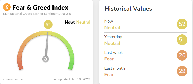 Index strachu a chamtivosti naznačuje, že nálada na trhu s kryptoměnami je opět neutrální v blízkosti 52 bodů. Index v posledních dnech poprvé a po několika měsících překročil hranici 50 bodů. Zdroj: alternative.me