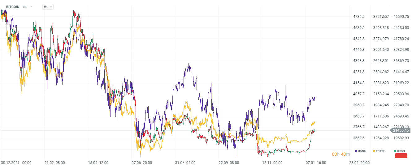 Bitcoin, Ethereum (zlatá linie) a US500 (fialová linie), interval H4. Euforie mezi kryptoměnami pokračuje, zatímco akciový trh zaznamenává jisté zlepšení nálady tváří v tvář klesající inflaci, pomalu slábnoucí ekonomice a klesajícím argumentům Fedu pro zachování velmi restriktivního cyklu zvyšování sazeb. Korelace bitcoinu a etherea s indexem S&P500 pokračuje. Zdroj: xStation5