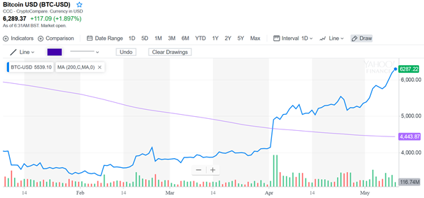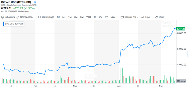 Celý duben se pak nesl ve znamení stabilizace ceny Bitcoinu nad hranicí 5 000 dolarů. Od začátku května však nejvýznamnější kryptoměna opět roste. Za toto období připsala již téměř 50 %, jenom za posledních pár dní můžeme hovořit o 20 procentním nárůstu ceny až na téměř 8 300 dolarů.