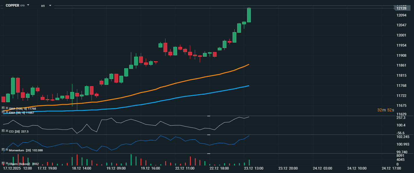 Meď pokračuje vo svojom extrémne silnom vzostupnom trende na hodinovom grafe, pričom cena práve dosiahla nové historické maximum 12 128 USD. Tento pohyb sprevádza významná dynamika a objem, čo potvrdzuje silnú vlnu nákupov. Kĺzavé priemery EMA 50 (11 867 USD) a SMA 100 (11 768 USD) jasne rastú a sú značne pod aktuálnou cenou, čo naznačuje silný trend a momentálne veľmi prekúpený trh. CCI (237,5) aj dynamika (102,1) dosahujú extrémne vysoké hodnoty, čo potvrdzuje prekúpený stav trhu, ale aj intenzitu rastového impulzu. Objem obchodovania sa spolu s cenou výrazne zvýšil, čo potvrdzuje platnosť vzostupného pohybu.
