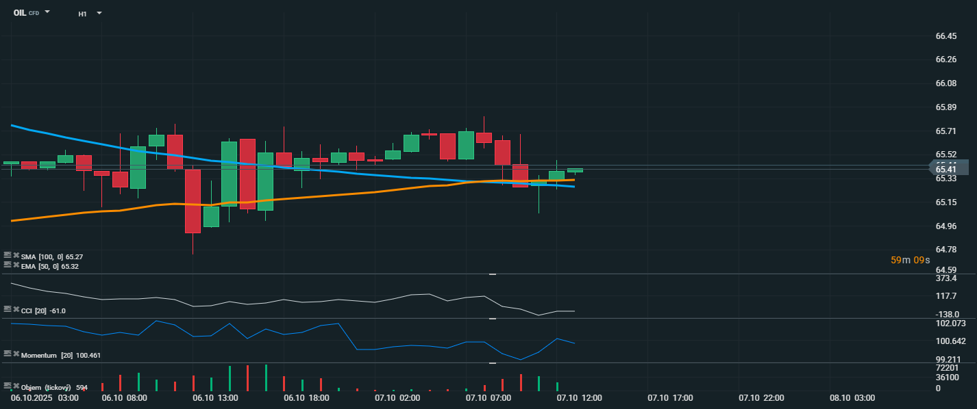 Cena ropy sa pohybuje okolo 65,41 USD a po miernom výpredaji zostáva v úzkom pásme v blízkosti kĺzavých priemerov EMA 50 (65,32 USD) a SMA 100 (65,27 USD). Tieto priemery sa aktuálne zbiehajú, čo naznačuje stratu smerového trendu a pripravenosť trhu na možný nový impulz. Krátkodobo sa trh snaží stabilizovať, pričom posledné sviečky naznačujú návrat kupcov po prepade, ktorý však neprerazil pod silnejšie supporty v zóne 65,00–65,15 USD. CCI je na -61,0, čo značí miernu prepredanosť, zatiaľ čo momentum rastie a drží sa nad hodnotou 100, čo naznačuje náznaky oživenia nákupnej aktivity. Objem obchodov zostáva relatívne slabý, čo môže limitovať ďalší pohyb bez silnejších fundamentálnych správ. Vzhľadom na predchádzajúci konsolidačný vývoj a súčasnú neistotu na trhu s ropou je pravdepodobné, že cena bude krátkodobo oscilovať okolo 65,30–65,60 USD. Pre potvrdenie rastu bude dôležité sledovať, či cena dokáže zostať nad kĺzavými priemermi a prekonať lokálnu rezistenciu na 65,71 USD. Naopak, prieraz pod 64,95–65,00 USD by mohol znamenať pokračovanie korekcie.