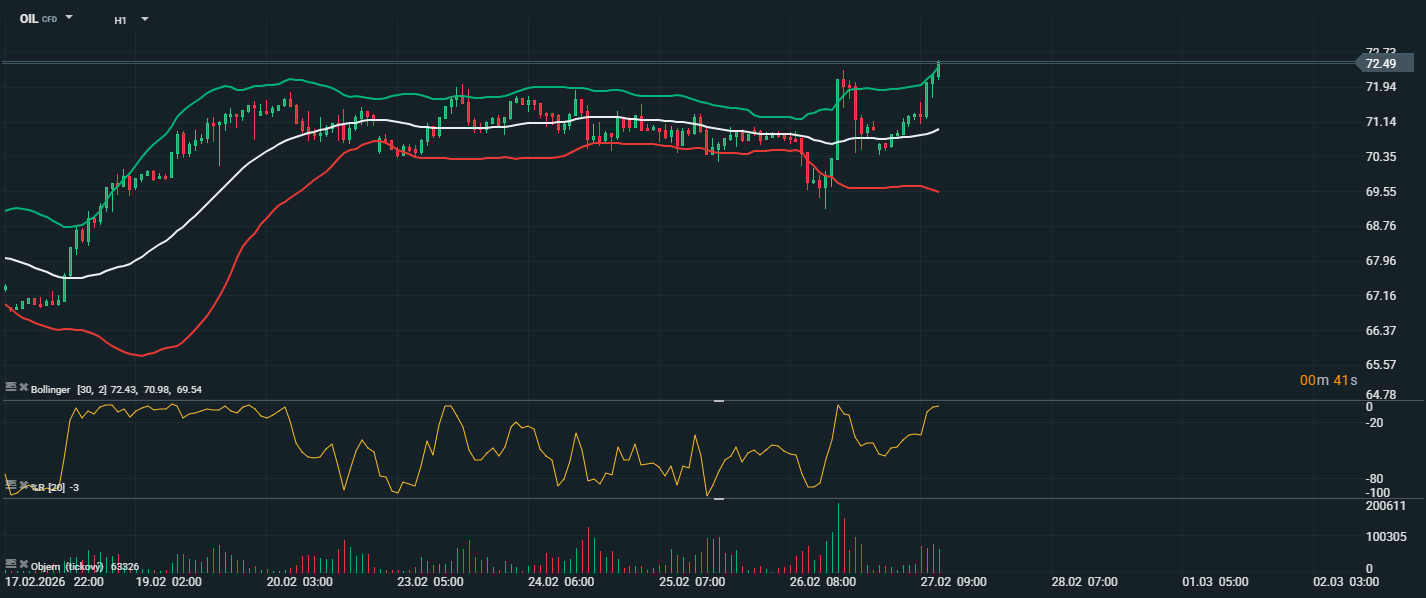 Cena ropy sa pohybuje okolo 72,49 USD a po predchádzajúcej konsolidácii prelomila smerom nahor. V súčasnosti sa nachádza na hornej hranici Bollingerovho pásma (približne 72,50 USD), čo potvrdzuje silný krátkodobý moment. Stredná línia pásma sa nachádza okolo 70,98 USD a funguje ako dynamická podpora. Dolný pás je na úrovni 69,54 GBP, čo predstavuje významnejšiu krátkodobú podporu. Williams %R je hlboko v prekúpenom teritóriu, čo naznačuje silný nákupný tlak, ale tiež zvyšuje riziko krátkodobej korekcie alebo konsolidácie. Objem obchodovania sa počas rastu zvýšil, čo potvrdzuje platnosť súčasného pohybu.