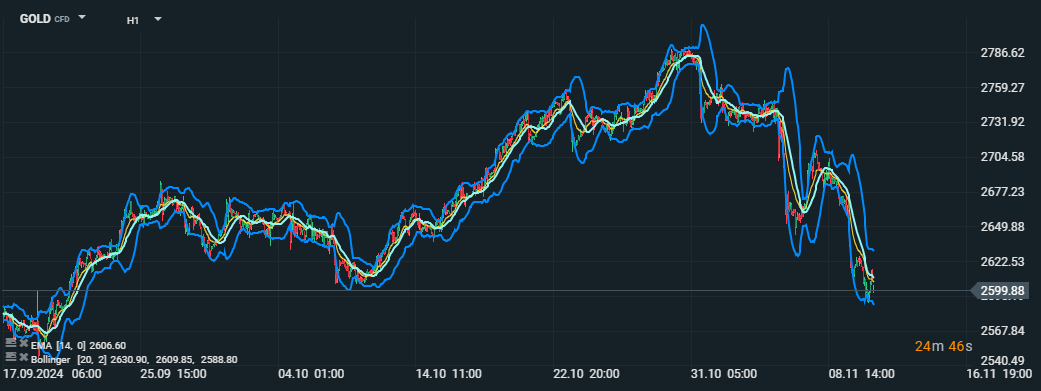 Cena zlata klesá pod vplyvom silnejšieho dolára a rastúcej inflácie v súvislosti s víťazstvom Donalda Trumpa; nástroj EMA a Bollingerove pásma naznačujú pokračujúci trend poklesu. Zdroj: xStation5