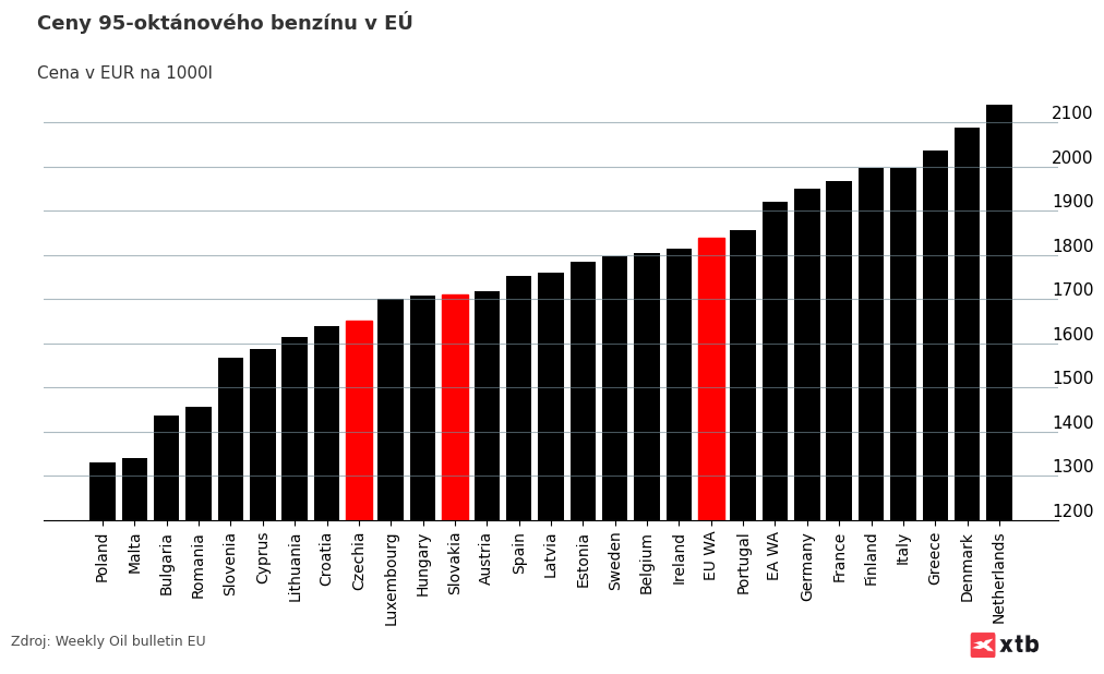 V porovnaní s Európskou úniou sme v cenách 95-oktánového benzínu na 12. mieste. Máme tak 12 najlacnejší benzín. V porovnaní s minulým týždňom sme sa v rebríčku neposunuli, a teda zvýšenie cien je tak badateľné naprieč európou. Česko tankuje benzín o niečo lacnejšie, a má tak 9. najlacnejší benzín v EÚ. Medzi susedmi, ktorý tankujú výrazne lacnejšie sú Poliaci, kde je nízka cena výsledkom nižšieho daňového zaťaženia.