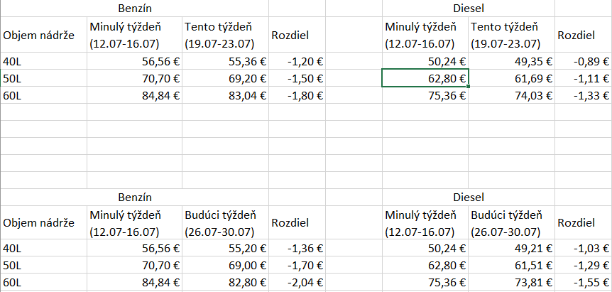 Analytik spoločnosti X-Trade Brokers, Lukáš Lipovský, na základe vývoja cien PHM v Rotterdame očakáva, že priemerné ceny benzínu a dieslu na Slovensku by mali v nasledujúcich dvoch až troch týždňoch zaznamenať pokles od dvoch do štyroch centov za liter oproti priemerným cenám z predchádzajúceho týždňa. Priemerné ceny benzínu sa na Slovensku behom minulého týždňa zvýšili o 1,9 centu za liter, pričom priemerné ceny dieslu zaznamenali nárast o 0,1 centu za liter oproti priemerným cenám z predchádzajúceho týždňa.