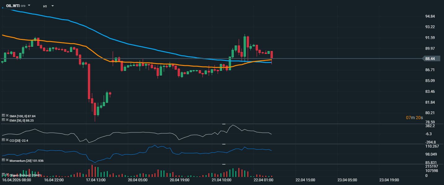 Ropa WTI sa obchoduje pri 88,44 USD a po predchádzajúcom raste prešla do korekcie. Cena sa teraz drží len tesne nad EMA 50 na úrovni 88,25 USD a zároveň nad SMA 100 na hodnote 87,84 USD, takže krátkodobá technická štruktúra ešte nie je vyslovene medvedia, no býčie momentum citeľne slabne. Po rýchlom raste do oblasti 91,88 USD prišlo odmietnutie vyšších cien a následný návrat späť k hlavným kĺzavým priemerom, čo ukazuje na oslabovanie nákupnej sily. CCI sa pohybuje okolo -22,4, teda v neutrálnom až mierne negatívnom pásme, a Momentum na úrovni 101,9 naznačuje, že trh síce ešte úplne nestratil rastovú dynamiku, no tá už nie je taká presvedčivá ako počas predchádzajúceho impulzu. Z technického pohľadu bude teraz kľúčové, či si WTI udrží pásmo 88,2 až 87,8 USD. Ak áno, trh sa môže opäť pokúsiť o návrat k 89,9 až 91,5 USD. V prípade prierazu nižšie by sa naopak otvoril priestor pre hlbšie oslabenie.