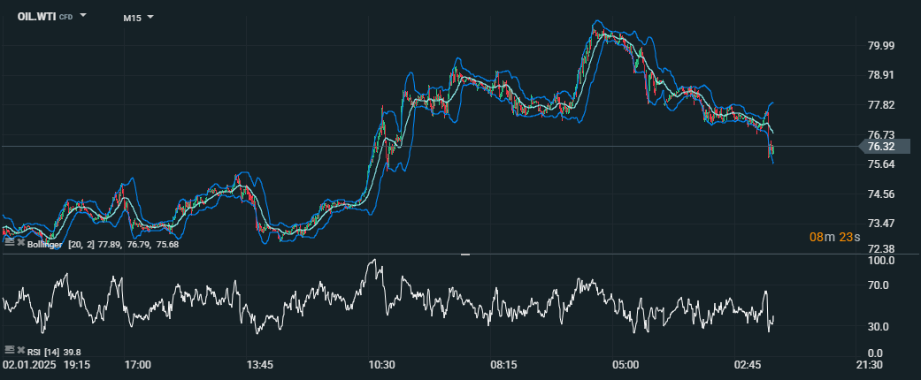 Vývoj ceny WTI ropy (OIL.WTI CFD) na 15-minútovom grafe s indikátormi Bollingerove pásma (perióda 20) a Index relatívnej sily (RSI, perióda 14). Cena ropy klesla z denného maxima 77,89 USD za barel na aktuálnu hodnotu 76,32 USD. RSI na úrovni 39,8 signalizuje oslabenie trhu, pričom Bollingerove pásma naznačujú zvýšenú volatilitu. Zdroj: xStation5