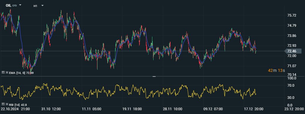 Ceny ropy Brent sa pohybujú okolo 73 USD za barel, pričom signál Fedu o pomalšom znižovaní sadzieb vyvoláva obavy zo slabšieho globálneho dopytu. Zdroj: xStation5