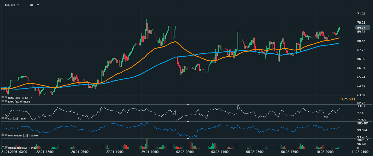 Cena ropy sa v súčasnosti pohybuje okolo 69,70 USD a postupne sa približuje k lokálnej rezistencii v oblasti 70,00 USD, ktorá v minulosti fungovala ako silná bariéra. Trh zostáva stabilný nad oboma kĺzavými priemerkami – EMA 50 (68,85 GBP) a SMA 100 (68,37 GBP) – čo potvrdzuje pozitívny krátkodobý výhľad. Štruktúra trhu vykazuje sériu vyšších miním a vyšších maxím, čo je typickým znakom býčieho trendu. Po predchádzajúcej korekcii začiatkom februára sa opäť obnovil rastový trend a cena sa postupne vracia k predchádzajúcim maximám. CCI je na úrovni 186,6, čo signalizuje výrazné prekúpenie trhu. To potvrdzuje silný nákupný tlak, ale zároveň zvyšuje pravdepodobnosť krátkodobej konsolidácie alebo mierneho poklesu. Momentum sa drží okolo hodnoty 100, čo naznačuje stabilnú dynamiku rastu bez výrazného vyčerpania. Z technického hľadiska je dôležité sledovať, či dôjde k prelomeniu psychologickej hranice 70 USD. Prekročenie tejto úrovne by mohlo otvoriť priestor smerom k 70,50 – 71,00 USD. Naopak, návrat pod EMA 50 by mohol znamenať krátkodobé ochladenie a návrat do rozpätia okolo 68,50 USD.