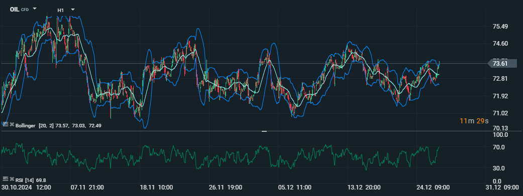Ceny ropy sa pohybujú okolo 73,61 USD za barel; Bollingerove pásma naznačujú zvýšenú volatilitu, zatiaľ čo RSI na úrovni 69,8 ukazuje na blížiaci sa prekúpený trh. Zdroj: xStation5