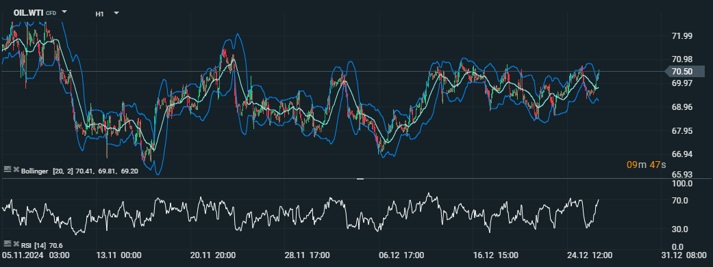 Ceny ropy WTI sa držia na 70,50 USD za barel; Bollingerove pásma ukazujú stabilnú volatilitu, zatiaľ čo RSI na úrovni 70,6 naznačuje prekúpený trh. Zdroj: xStation5