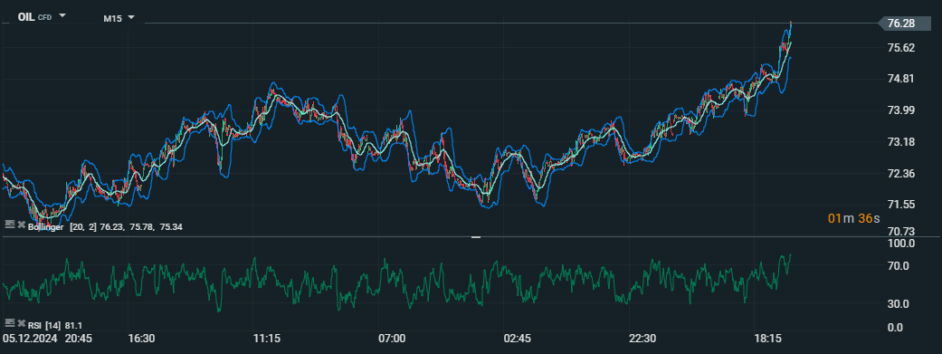 Tento graf znázorňuje dynamiku cien ropy WTI s použitím Bollingerových pásiem (20, 2) a RSI (14). Prienik Bollingerových pásiem nahor a RSI nad 70 signalizujú silný nákupný tlak a rastúci dopyt. Zdroj: xStation5
