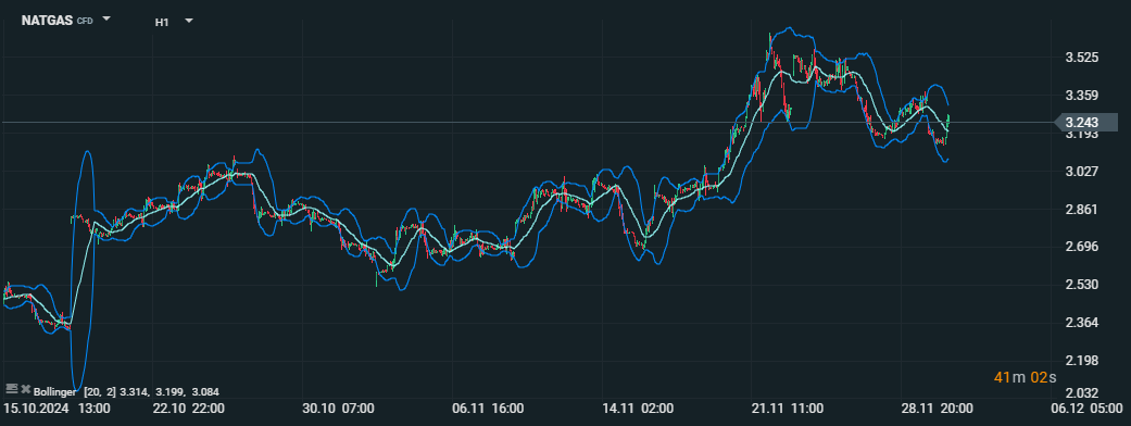 Analýza cien zemného plynu (NATGAS CFD) s využitím Bollingerových pásiem a hodinového grafu. Zdroj: xStation5