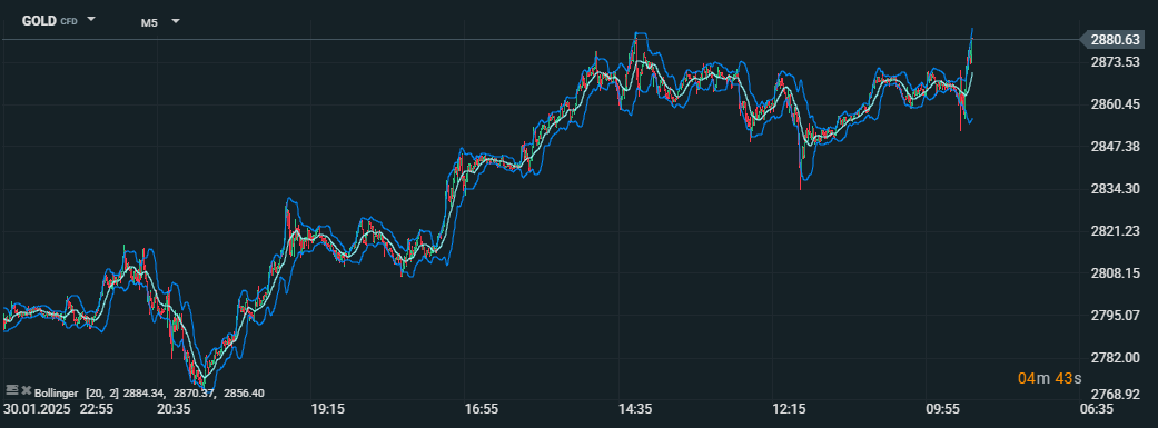 Cena zlata stúpla na 2 880,63 USD, čím sa priblížila historickým maximám, keďže investori vyhľadávajú bezpečné aktíva v období ekonomickej neistoty. Bollingerove pásma (20,2) poukazujú na zvýšenú volatilitu, pričom ceny často testujú horné pásmo, čo signalizuje silný rastový trend na trhu. Zdroj: xStation5