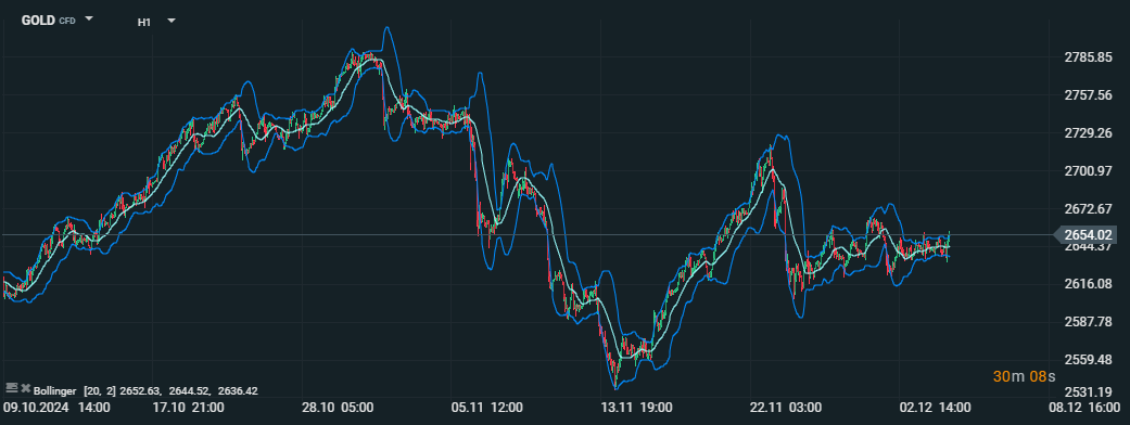 Analýza cien zlata s použitím Bollingerových pásiem (20,2) na H1 grafe – Graf zdôrazňuje nedávnu volatilitu cien a kľúčové úrovne podpory/odporu, ktoré môžu naznačovať budúce pohyby trhu v reakcii na očakávané údaje z USA. Zdroj: xStation5