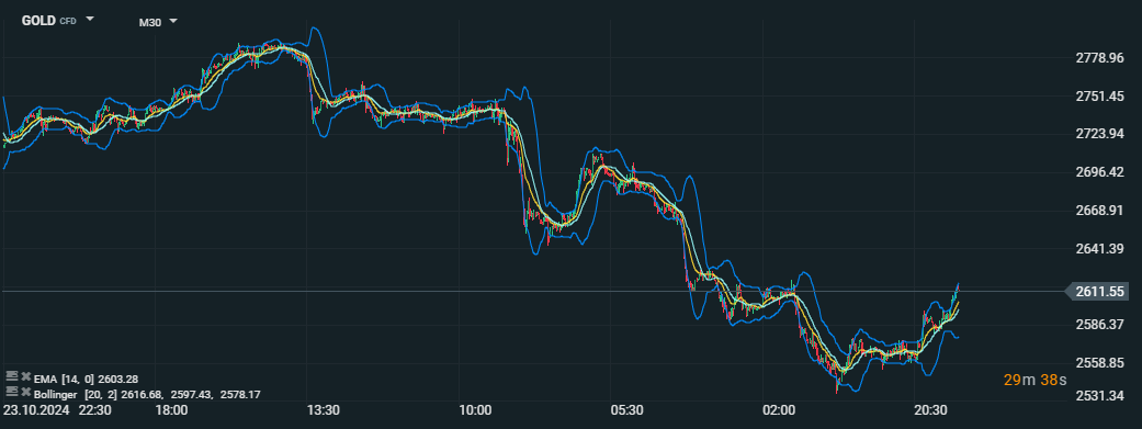 Ceny zlata sa zotavujú po oslabení dolára a poklese dopytu po bezpečných aktívach. Použitie technických nástrojov Bollingerove pásma a EMA na analýzu trhu. Zdroj: xStation5