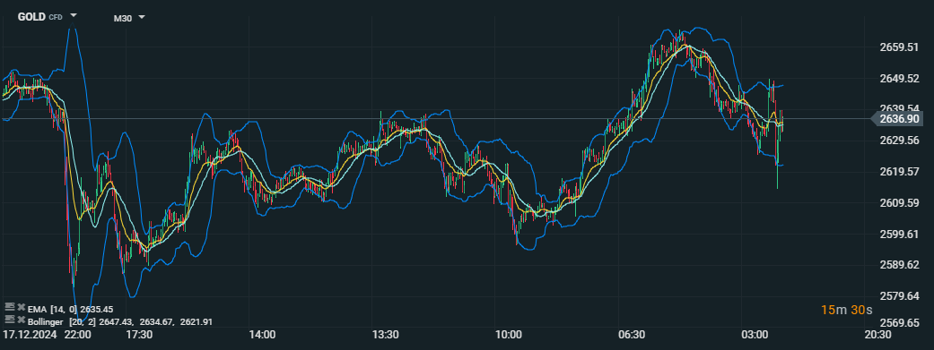 "Kolísanie cien zlata v dôsledku politiky Fedu a geopolitickej neistoty" Tento graf znázorňuje pohyb cien zlata s použitím Bollingerových pásiem (20, 2) a exponenciálneho kĺzavého priemeru (EMA 14). Ceny zostávajú volatilné, čo odráža reakcie investorov na očakávania týkajúce sa sadzieb Fedu a pretrvávajúce geopolitické napätie, pričom úroveň podpory sa drží okolo 2 630 USD za uncu. Zdroj: xStation5