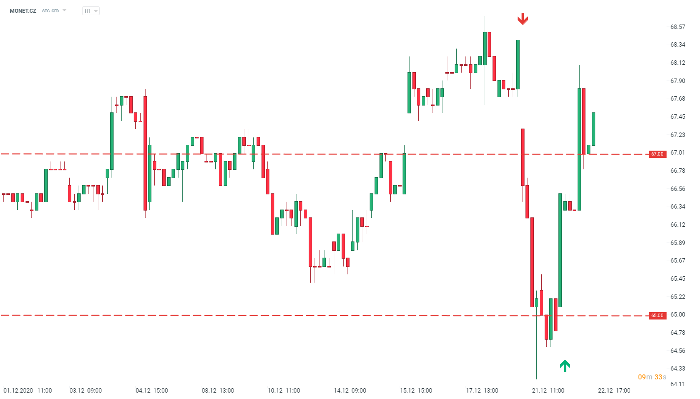 Banka Moneta si dnes dokázala vzít zpět velkou část včerejších masivních ztrát. Její akcie vzrostly o 4,79 % a opět se přiblížily postpandemickému maximu. Zdroj: xStation5