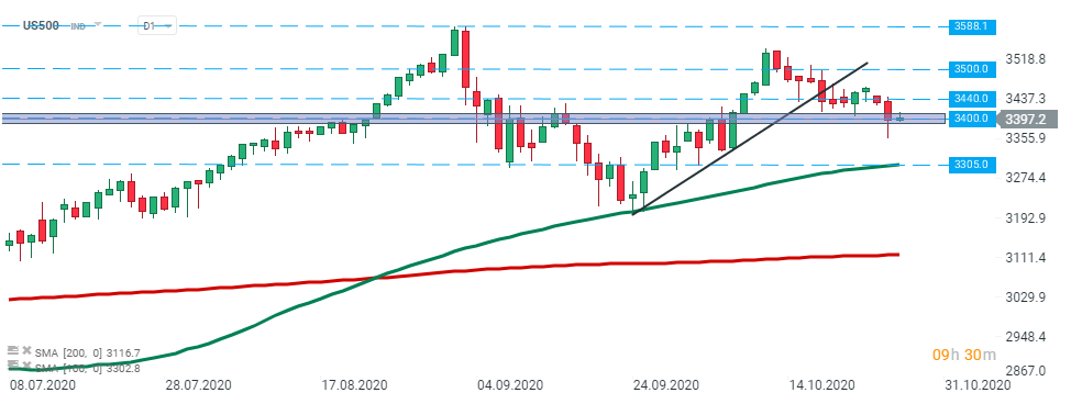 US500 testuje klíčový support na úrovní 3 400 bodů. Pokud se prodejcům podaří cenu stlačit na nižší úrovně, tak se můžeme dočkat propadu až k úrovni 3 305 bodů. Pokud naopak býci převezmou otěže, tak cenový růst může brzy dosáhnout rezistence na 3 440 bodech. Zdroj: xStation5