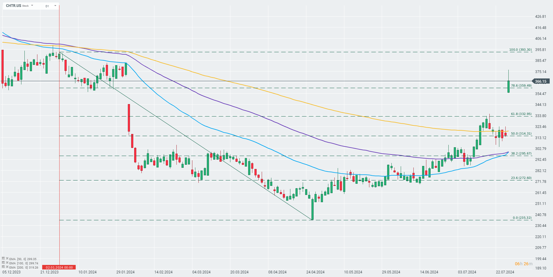 Akcie spoločnosti Charter Communications (CHTR.US) dnes vzrástli o takmer 17 % po tom, čo spoločnosť oznámila výsledky za druhý štvrťrok, ktoré prekonali očakávania analytikov, pričom voľný peňažný tok bol v správe obzvlášť pozitívnym prekvapením. Okrem toho, strata predplatiteľov širokopásmového internetu Charty v druhom štvrťroku bola výrazne nižšia ako konsenzus 230 000 (skutočná strata bola 149 000), čo naznačuje, že koniec programu cenovo dostupného pripojenia mal kontrolovanejší vplyv, než sa pôvodne obávalo.