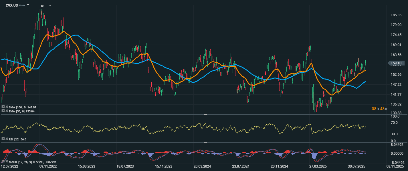 Akcie Chevronu sa aktuálne obchodujú na cene 159,10 USD. Cena sa pohybuje nad kĺzavými priemermi EMA 50 (155,04 USD) aj SMA 100 (149,07 USD), čo potvrdzuje pokračujúci býčí trend. RSI dosahuje 56 bodov, teda v neutrálnom pásme, s dostatočným priestorom na ďalší rast bez známok prekúpenosti.