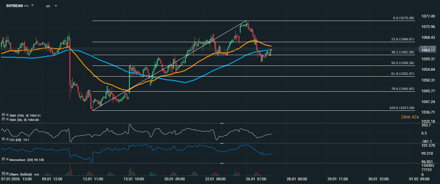 Ceny sójových bôbov sa po nedávnom raste odrazili od maxima 1 075,68 USD, odkiaľ následne korigovali späť pod úroveň 23,6 % Fibonacciho retracementu (1 066,67 USD). Aktuálne sa obchodujú na 1 063,17 USD, tesne pod dôležitými kĺzavými priemermi EMA 50 (1 064,80 USD) a SMA 100 (1 063,41 USD), ktoré momentálne pôsobia ako rezistencia. Korekcia ceny zatiaľ našla oporu nad 38,2 % retracementom na 1 061,09 USD, čo je krátkodobo kľúčová technická úroveň. Ak by bola prelomená, ďalšia podpora sa nachádza na 50 % hladine (1 056,58 USD) a následne na 61,8 % (1 052,07 USD). CCI sa pohybuje mierne pod neutrálnou líniou (-19,1), čo signalizuje oslabenie býčieho momenta. Momentum však smeruje nahor a hodnota nad 99 naznačuje snahu trhu o stabilizáciu a možné obnovenie rastu. Cena sa zároveň snaží udržať nad zónou, kde sa stretávajú EMA a SMA, čo môže byť kľúčové pre ďalší vývoj.
