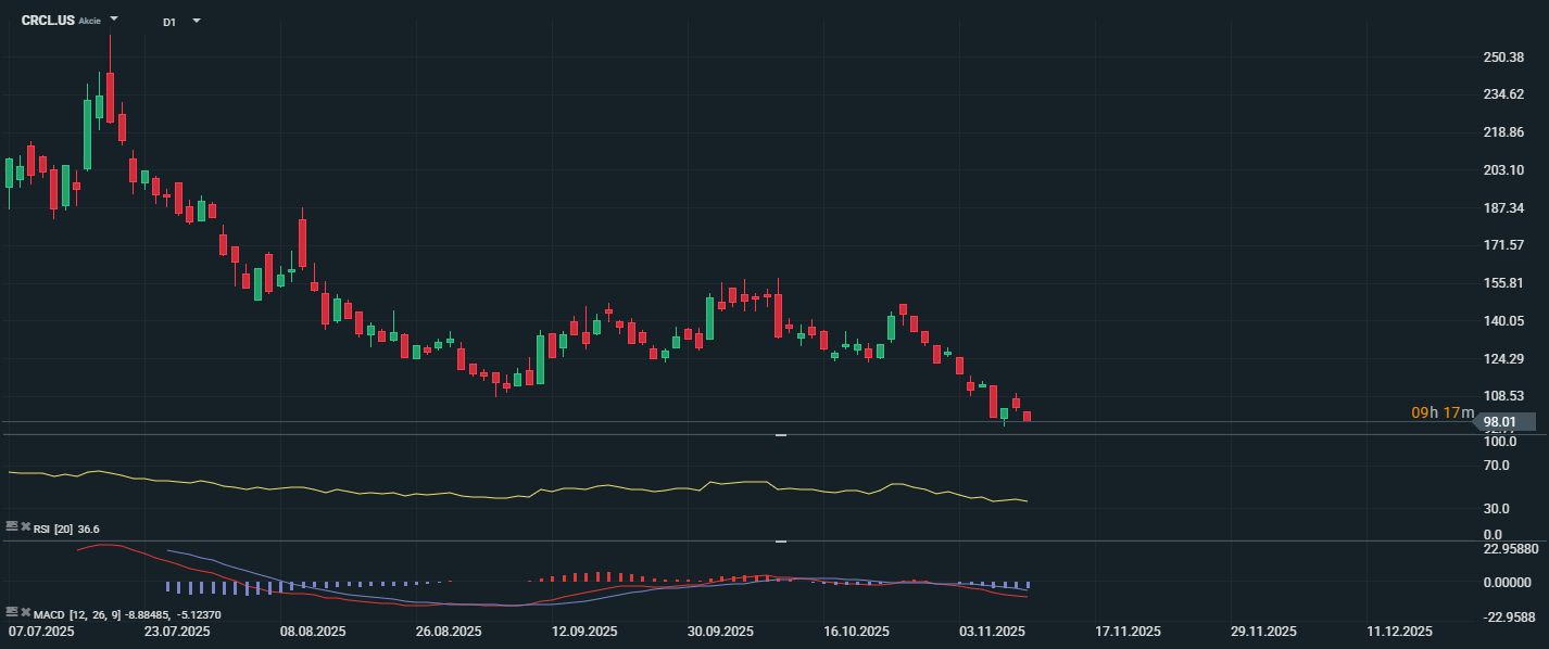Akcie spoločnosti Circle napriek pozitívnym výsledkom za 3. štvrťrok naďalej vykazujú slabnúce technické nastavenie. Aktuálne sa obchodujú na úrovni 98,01 USD, čo predstavuje dlhodobý klesajúci trend od vrcholu v júli 2025. RSI sa pohybuje na hodnote 36,6, teda tesne nad prepredanou zónou, čo môže signalizovať slabnúci predajný tlak, no zatiaľ bez známok obratu trendu.